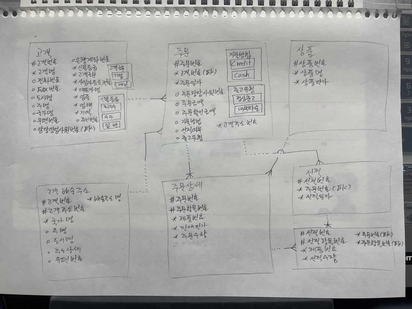 | (작성기준 설명) 고객-주문은 비식별 관계(Non-Identification Relationship, 관계에 세로줄이 없음.)이고, 주문-주문상세는 식별관계(Identification Relationship, 관계에 세로줄이 있음)이다. 고객에서 고객구분, 신용등급은 슈퍼타입-서브타입으로 표시한다. 하나의 주문에 하나 또는 여러 번의 선적이 있을 수 있어서, Entity를 분리한다. 주문의 선적날짜는 최초 선적일 또는 가장 최근 선적일로 표현할 수 있다.(고객 요청 또는 업무정의에 따라 표시하기로 함.) 고객의 주소와 배송주소가 다를 수 있고, 배송 주소가 여러개 일 수 있어서, Entity를 분리한다. |