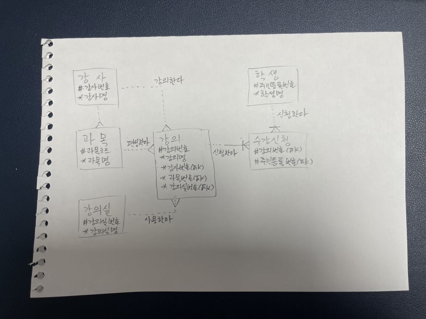 | 모델링과 데이터베이스 설계 및 구축을 포함한 IT 기술을 전문적으로 강의하는 우리학원에는 강사가 10명 있으며, 각각의 강사가 담당하는 과목은 한 과목인 강사도 있고, 두 과목 이상 강의하는 강사도 있다. 강사는 반드시 한 과목 이상 강의한다. 학원 과목은 여러 명의 강사가 강의할 수도 있다. 과목에 따라서는 선수 과목을 듣지 않으면 수강할 수 없는 과목도 있다. 선수 과목은 여러 과목이 있을 수 있다. 학원 강의실은 20개가 있으므로 강의 계획을 잘 수립하여야 한다. 한 강의의 수강생은 여러 명일 수 있으며, 만약 수강생이 한 명도 없다면, 강의가 이루어 질 수 없다. 강의가 없는 강의실도 존재할 수 있다. 한 번 수강했던 학생이 다시 수강하면, 기존 등록정보를 활용하면 좋다. 강사는 강사번호로 관리하고, 과목에는 과목 코드가 있다. 강의실마다 강의실 번호가 있으며, 수강생은 주민등록번호로 관리한다. |