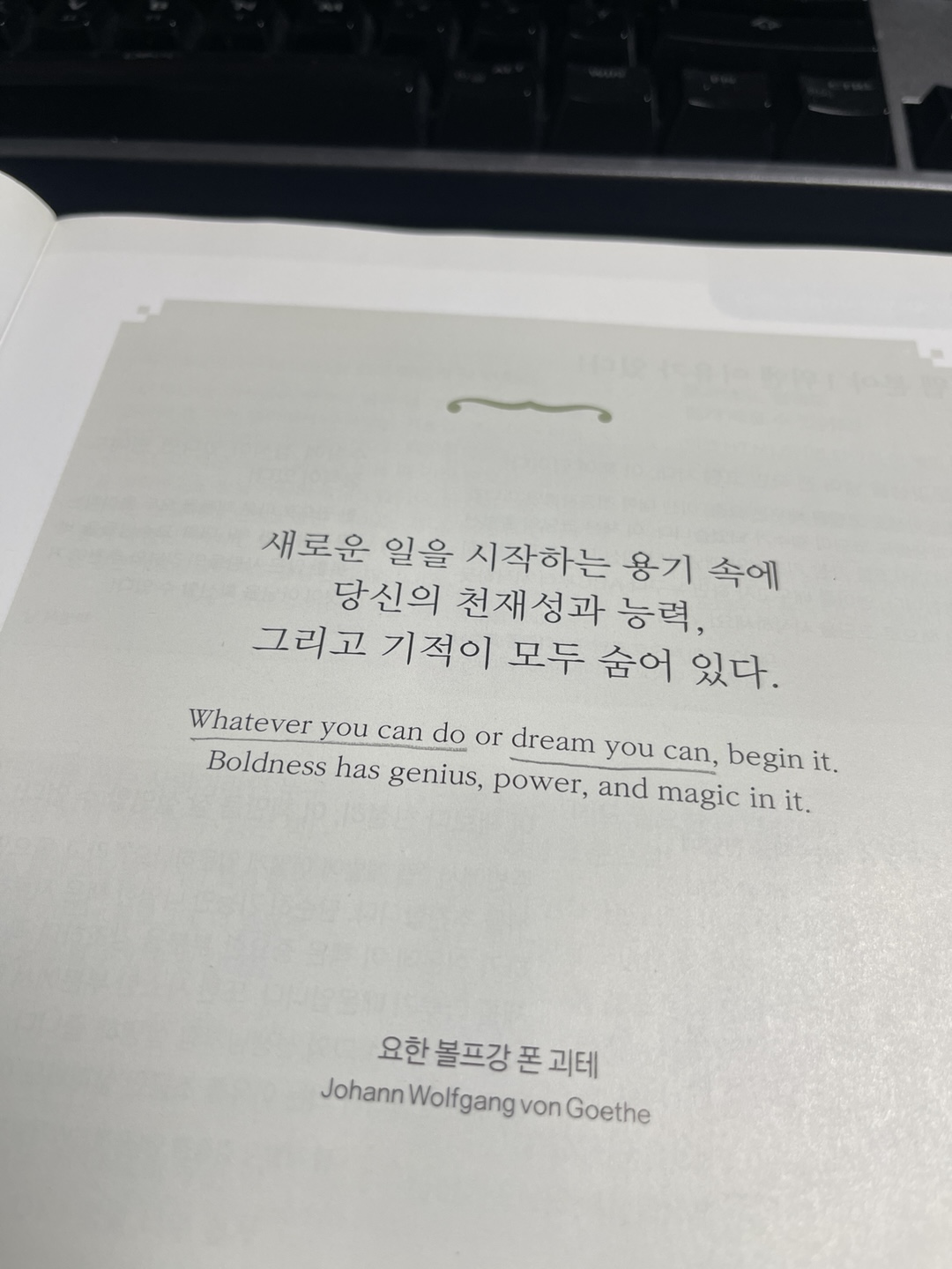 "Whatever you can do"는 "네가 할 수 있는 모든 것"이라는 뜻입니다. 이는 보통 상대방이 할 수 있는 일이나 능력을 강조할 때 쓰이는 표현입니다. 예를 들어, "You can do whatever you want"처럼 말할 수 있습니다."Dream you can"이라는 표현은 "네가 꿈꿀 수 있는 것" 또는 "네가 할 수 있는 꿈"이라는 의미로 해석될 수 있습니다. 문맥에 따라 "네가 할 수 있는 꿈을 꾸어라"라는 의미로 쓰일 수 있습니다."Whatever you can do or dream you can, begin it. Boldness has genius, power, and magic in it." 이 문장은 요한 볼프강 폰 괴테의 유명한 말로, 꿈을 실현하려면 두려움을 버리고 ..